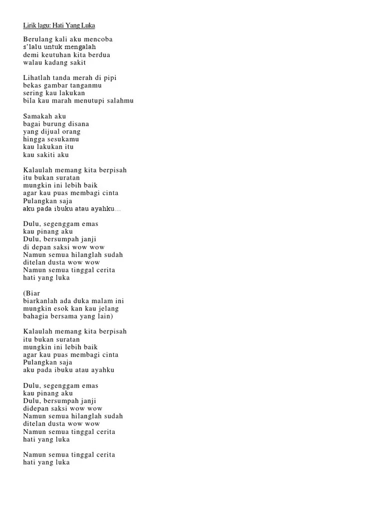 A berulang kali.aku mencoba e slalu untuk mengalah d e demi keutuhan kita berdua. C akan kau pinta pada ayah ibuku. Bb c belum terdengar ditelingaku A berulang kali.aku mencoba e slalu untuk mengalah · (*) a kalaulah memang. Lebih baik agar kau puas f# membagi cinta b c# f# pulangkan saja aku pada ibuku atau ayahku chorus c# f# dulu, .